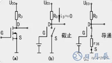 uGS>開啟電壓UT:MOS管工作在導(dǎo)通區(qū),漏源電流iDS=UDD/(RD rDS)。其中,rDS為MOS管導(dǎo)通時的漏源電阻。輸出電壓UDS=UDD·rDS/(RD rDS),如果rDS《RD,則uDS≈0V,MOS管處于“接通”狀態(tài),其等效電路如上圖(c)所示。