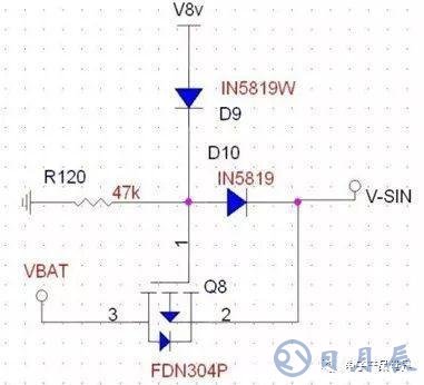 由PMOS來進行電壓的選擇,當(dāng)V8V存在時,此時電壓全部由V8V提供,將PMOS關(guān)閉,VBAT不提供電壓給VSIN,而當(dāng)V8V為低時,VSIN由8V供電。注意R120的接地,該電阻能將柵極電壓穩(wěn)定地拉低,確保PMOS的正常開啟,這也是前文所描述的柵極高阻抗所帶來的狀態(tài)隱患。D9和D10的作用在于防止電壓的倒灌。D9可以省略。這里要注意到實際上該電路的DS接反,這樣由附生二極管導(dǎo)通導(dǎo)致了開關(guān)管的功能不能達到,實際應(yīng)用要注意。