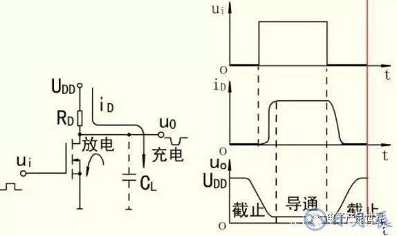 MOS管在導(dǎo)通與截止兩種狀態(tài)發(fā)生轉(zhuǎn)換時同樣存在過渡過程,但其動態(tài)特性主要取決于與電路有關(guān)的雜散電容充、放電所需的時間,而管子本身導(dǎo)通和截止時電荷積累和消散的時間是很小的。下圖分別給出了一個NMOS管組成的電路及其動態(tài)特性示意圖。