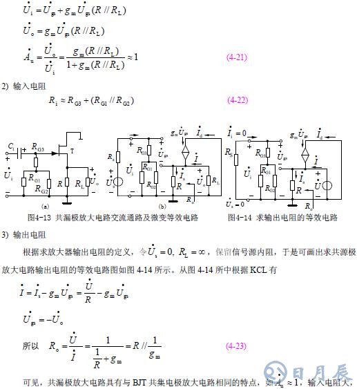 共漏極放大電路如圖4-12 所示。由圖可見,共漏極放大電路 的直流偏置電路與共源極放大電路完全相同,靜態(tài)工作點的分析方 法也和共源極放大電路相同。但輸出電壓從源極取出,交流通路和微變等效電路如圖4-13 所示。