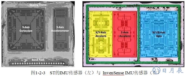 集成若干軸加速度計(jì)和陀螺儀為一體,可構(gòu)成IMU(Inertial Measurement Unit慣性測量單元),IMU可用于測量物體三軸姿態(tài)角(或角速率)以及加速度。ST的九軸MEMS IMU傳感器(三軸陀螺儀+三軸加速度計(jì))、InvenSense的九軸IMU傳感器(三軸陀螺儀+三軸加速度計(jì)),如圖2-2-3所示。