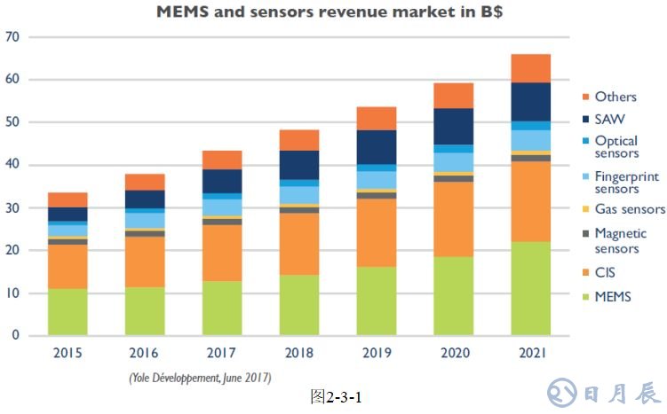 按Yole預(yù)測,2017年MEMS傳感器銷售額占全部傳感器市場的30%,約120億美元。2015-2021年MEMS傳感器年均增長率約為14%,高于全部傳感器市場12%的增長率。如圖2-3-1所示。