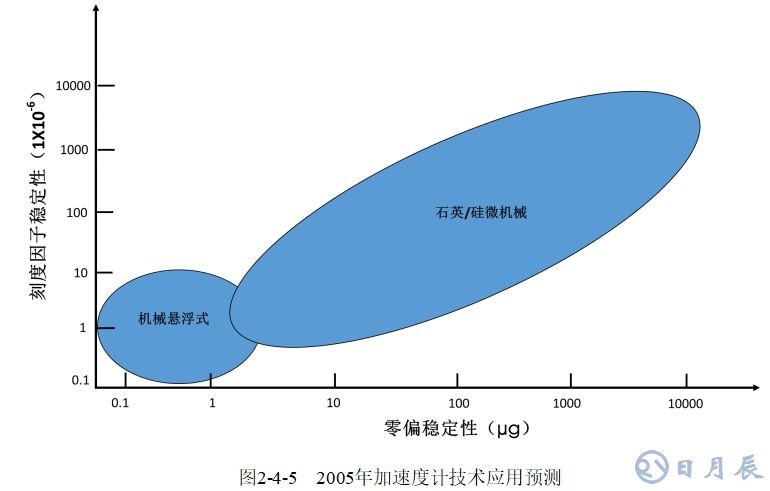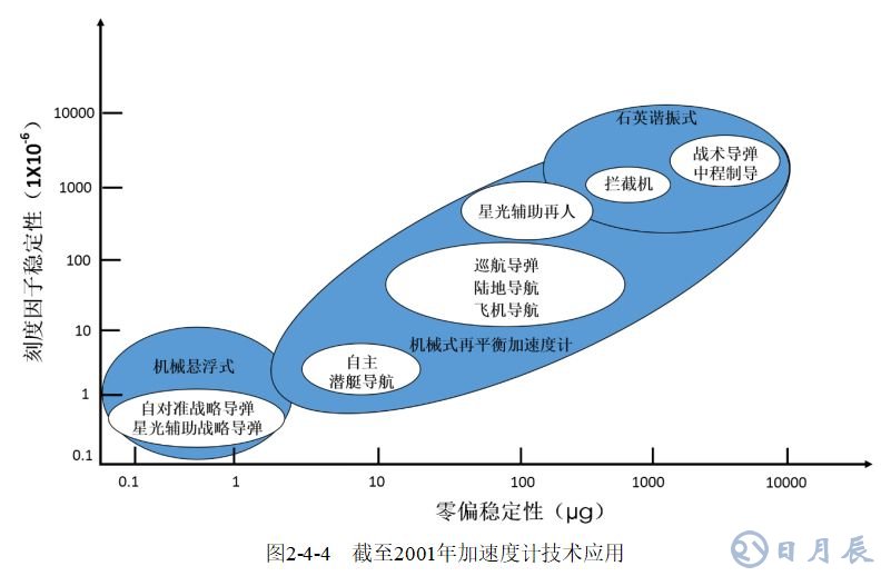 美國Draper實(shí)驗(yàn)室對2001年、2005年和2020年加速度計(jì)的發(fā)展和應(yīng)用進(jìn)行了分析和預(yù)測(如圖2-4-4、2-4-5、2-4-6所示),從中可以看出各種陀螺儀的發(fā)展趨勢。