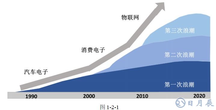 MEMS慣性傳感器主要是指MEMS加速度計(jì)和MEMS陀螺儀。MEMS慣性傳感器在1990年代開始規(guī)模應(yīng)用在汽車工業(yè)和國防工業(yè),20世紀(jì)初開始應(yīng)用于手機(jī)等消費(fèi)電子領(lǐng)域,物聯(lián)網(wǎng)有望引領(lǐng)下一波增長浪潮(如圖2-1-1所示)。