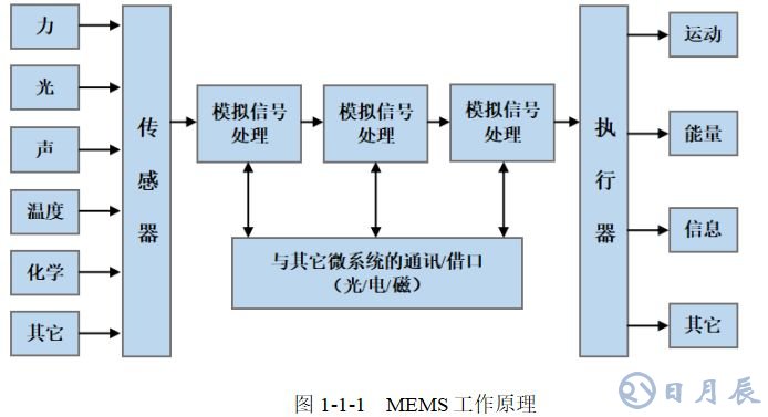 MEMS其工作原理是外部環(huán)境物理、化學(xué)和生物等信號輸入,通過微傳感器轉(zhuǎn)換成電信號,經(jīng)過信號處理(模擬信號或數(shù)字信號)后,由微執(zhí)行器執(zhí)行動作,達(dá)到與外部環(huán)境“互動”的功能。如圖1-1-1所示。