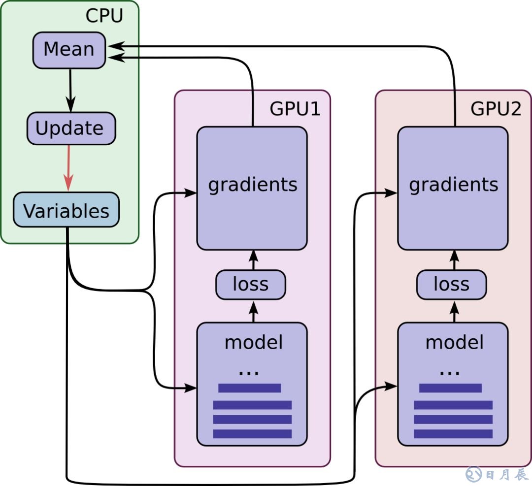GPU 會(huì)同步運(yùn)行。GPU 的所有梯度將累積并求平均值(如綠色方框所示)。模型參數(shù)會(huì)更新為所有模型副本的梯度平均值。