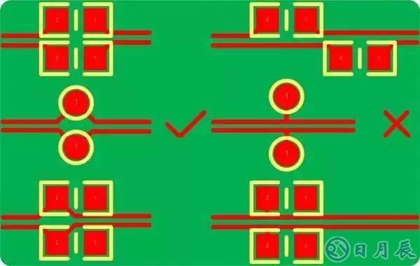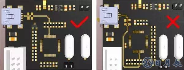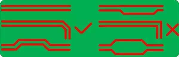 3. 對(duì)稱平行走線,這樣能保證兩根線緊耦合,避免90°走線,弧形或45°均是較好的走線方式(√為合理的方式,×為不合理方式);