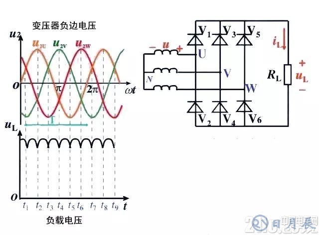 在一個周期中,每個二極管只有三分這一的時候導通(導通角為120度)。負載兩端的電壓為線電壓。