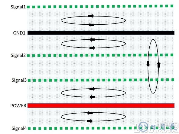 (1)由于信號層與回流參考平面相鄰,S1、S2、S3相鄰地平面,有最佳的磁通抵消效果,優(yōu)選布線層S2,其次S3、S1。