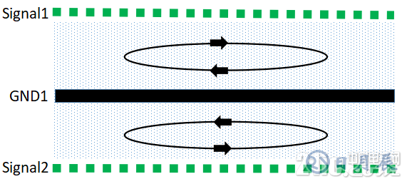 根據(jù)麥克斯韋方程,分立的帶電體或電流,它們之間的一切電的及磁的作用都是通過它們之間的中間區(qū)域傳遞的,不論中間區(qū)域是真空還是實體物質(zhì)。在PCB中磁通總是在傳輸線中傳播的,如果射頻回流路徑平行靠近其相應(yīng)的信號路徑,則回流路徑上的磁通與信號路徑上的磁通是方向相反的,這時它們相互疊加,則得到了通量對消的效果。