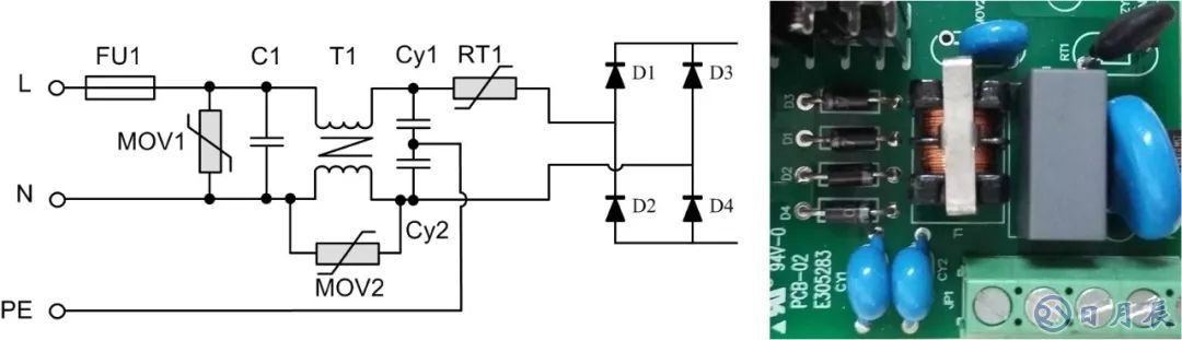 背景:以某型號的電源模塊為例,該模塊是ZLG致遠電子為某客戶定制的電源模塊,輸入85VAC~350VAC,且EMC前級電路電路嵌入到模塊中。抗浪涌要求差模電壓3KV,共模電壓6KV。更換更大的保險絲后可承受6KV差模電壓。其前級原理圖及對應(yīng)實物圖如圖2所示。