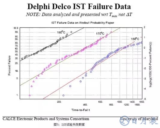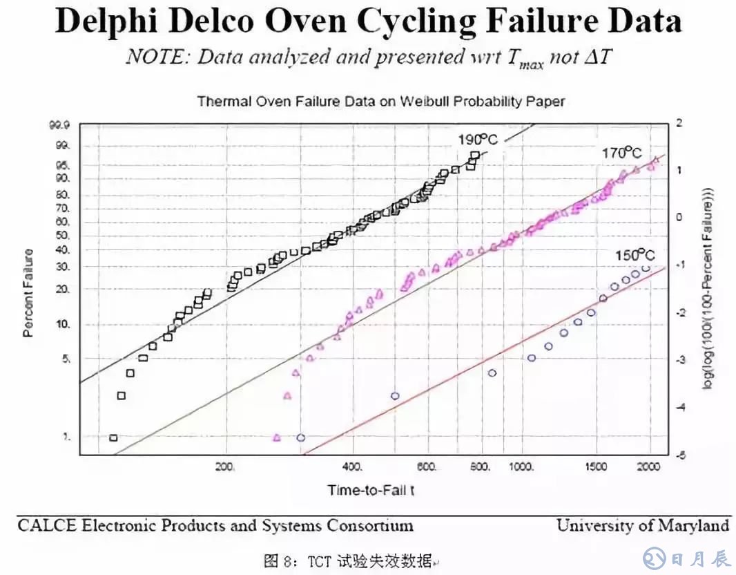 IST因為測試時間短,溫度轉(zhuǎn)換速率大,對測試樣品的疲勞老化影響也較大,故可以使試樣早早發(fā)生失效,比對圖7的IST失效數(shù)據(jù)和圖8的TCT失效數(shù)據(jù),可見在相同的條件下,IST試驗很早就發(fā)生的失效: