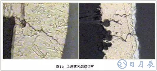 金屬疲勞產(chǎn)生的微裂,呈45°斜向微裂,常沿著晶格出現(xiàn),經(jīng)常裂在玻纖與樹脂交界處的銅壁,孔銅開裂附近之部份基材也有微裂,如圖11所示: