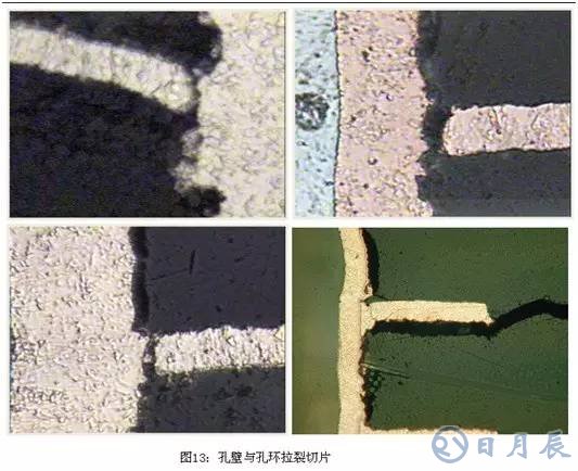 孔壁和孔環(huán)的拉裂,拉裂的孔環(huán)呈Z方向的走位,其主要是多次焊接高溫或材料Z-CTE較大造成, 如圖13所示: