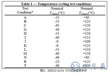 TCT:參考標(biāo)準(zhǔn)JESD22-A104E,兩箱式Air to Air溫度循環(huán)試驗(Temperature Cycling Test),共有13種高低溫匹配與4種留置時間CycleTime(1、5、10、15分鐘)的級別對應(yīng),以供用戶參考,如下圖2和圖3所示: