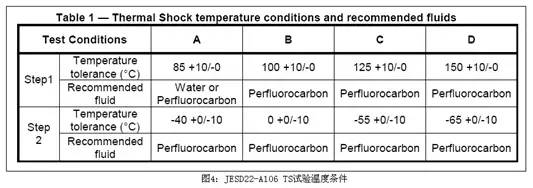 TST:參考標(biāo)準(zhǔn)JESD22-A106B,兩槽式Liquid to Liquid高低溫液體中之循環(huán)試驗,特稱為Thermal ShockTest熱沖擊試驗,試驗條件如下圖4所示: