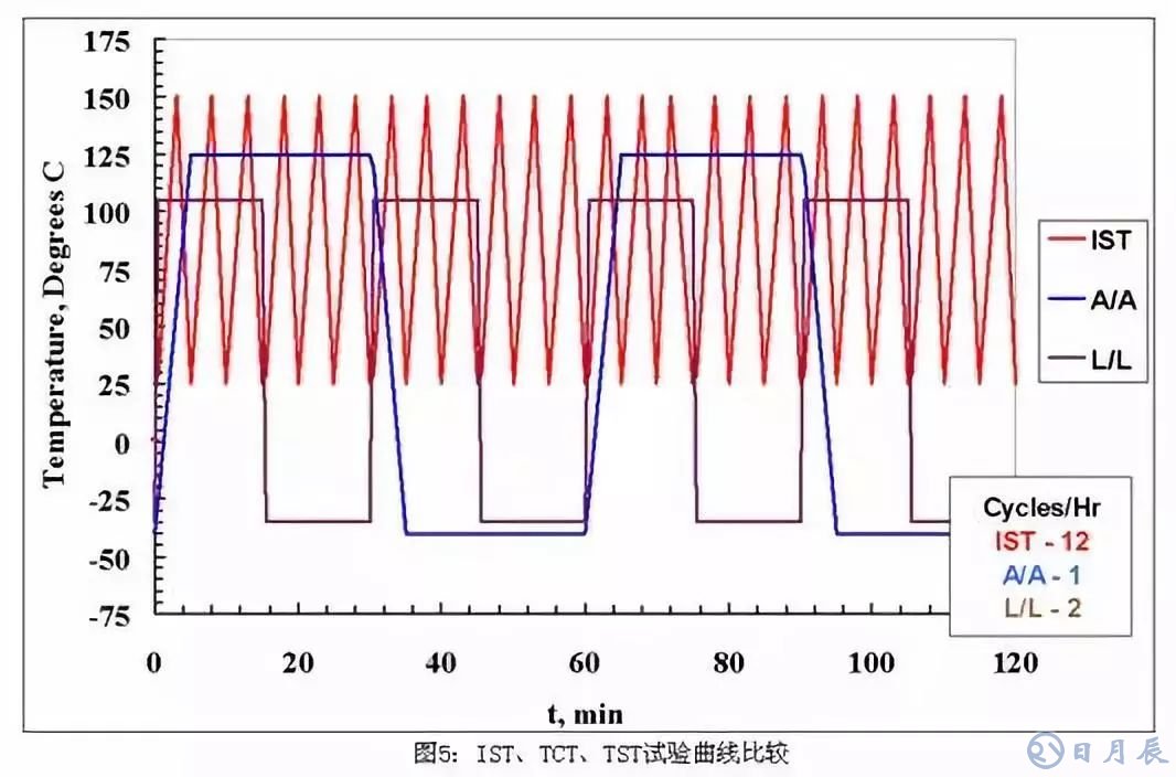 不管是TCT或是TST試驗,其試驗時間都是很長的,而IST時間明顯小于TCT和TST,常見的溫度循環(huán)測試曲線如圖5所示,由圖可以看出,液冷式的TST試驗,高低溫轉(zhuǎn)換速率是最大的,IST其次,TCT最小,而高低溫轉(zhuǎn)換速率越大,其對材料的沖擊也隨之增加,也就更容易失效: