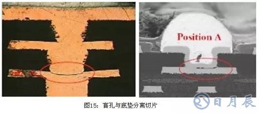 盲孔與底墊分離,主要是底墊銅面出現(xiàn)鈍化膜,或熱應(yīng)力較大(回流曲線熱量較高、多次焊接、局部過熱)造成,如圖15所示: