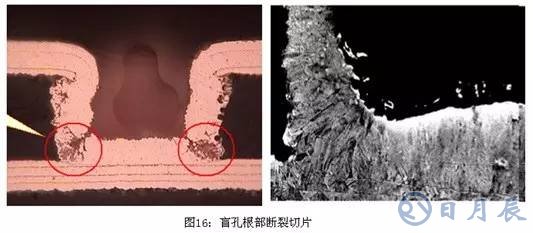 盲孔根部斷裂,主要是電鍍藥水老化或雜質(zhì)較多,造成鍍銅質(zhì)量下降,低電流處結(jié)晶疏松造成,如圖16所示: