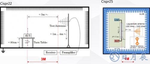如圖3所示電磁干擾的輻射測試普遍采用天線接收法測試,相比于CISPR22來說CISPR25額外增加了150KHz ~ 30MHz的輻射測試,這部分測試頻段覆蓋了DCDC的工作頻率范圍,是輻射測試的難點。另外CISPR-25輻射測試采用1M法天線距離更近,測試接收的信號更強。