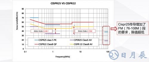 歷史上普遍接受的國際電磁干擾標準是CISPR-22,美國的電磁干擾標準是FCC,CISPR-22與FCC有所不同,但一般來說如果電源符合CISPR-22標準,那么它也符合FCC標準。總之CISPR-22標準已經(jīng)成為全世界都遵守的基本標準。汽車上的電磁干擾標準是CISPR-25,相對CISPR22來說CISPR-25標準限制值更低并且額外對FM頻段做了很嚴的限制要求。具體傳導測試限制要求如圖2所示。