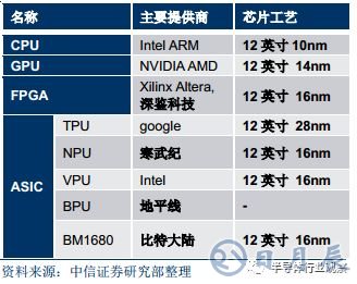 根據(jù) NVIDIA 與 AMD 公布的技術(shù)路線圖, 2018 年 GPU 將進(jìn)入 12nm/7nm 制程。 而目前 AI、礦機(jī)相關(guān)的 FPGA 及 ASIC 芯片也均采用了 10~28nm 的先進(jìn)制程。國(guó)內(nèi)廠商涌現(xiàn)了寒武紀(jì)、深鑒科技、地平線、比特大陸等優(yōu)秀的 IC 設(shè)計(jì)廠商率先實(shí)現(xiàn)突破,而制造則主要依靠臺(tái)積電等先進(jìn)制程代工廠商。