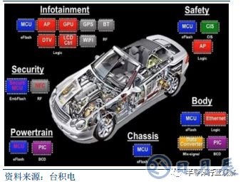 汽車電子對(duì)于半導(dǎo)體器件需求以 MCU、NOR Flash、IGBT 等為主。 傳統(tǒng)汽車內(nèi)部主要以 MCU 需求較高,包括動(dòng)力控制、安全控制、發(fā)動(dòng)機(jī)控制、底盤控制、車載電器等多方面。新能源汽車還包括電子控制單元 ECU、功率控制單元 PCU、電動(dòng)汽車整車控制單元 VCU、混合動(dòng)力汽車整車控制器 HCU、電池管理系統(tǒng) BMS 以及逆變器核心部件 IGBT 元件。