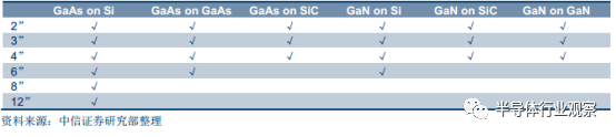 電子器件中,主要為射頻和功率應(yīng)用。 GaN on SiC、 GaN 自支撐襯底、 GaAs 襯底、GaAs on Si 主要應(yīng)用于射頻半導(dǎo)體(射頻前端 PA 等); 而 GaN on Si 以及 SiC 襯底主要應(yīng)用于功率半導(dǎo)體(汽車電子等)。