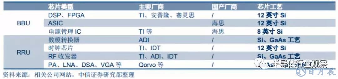 美國(guó)廠商壟斷大功率射頻器件。 具體來(lái)看, 目前 RRU 設(shè)備中的 PA、 LNA、 DSA、 VGA等芯片主要采用砷化鎵或氮化鎵工藝,來(lái)自 Qorvo、 Skyworks 等公司,其中氮化鎵器件通常為碳化硅襯底,即 GaN on SiC。 RF 收發(fā)器、數(shù)模轉(zhuǎn)換器采用硅基及砷化鎵工藝,主要廠商包括 TI、 ADI、 IDT 等公司。以上廠商均為美國(guó)公司,因而通信基站芯片對(duì)美國(guó)廠商依賴性極高。