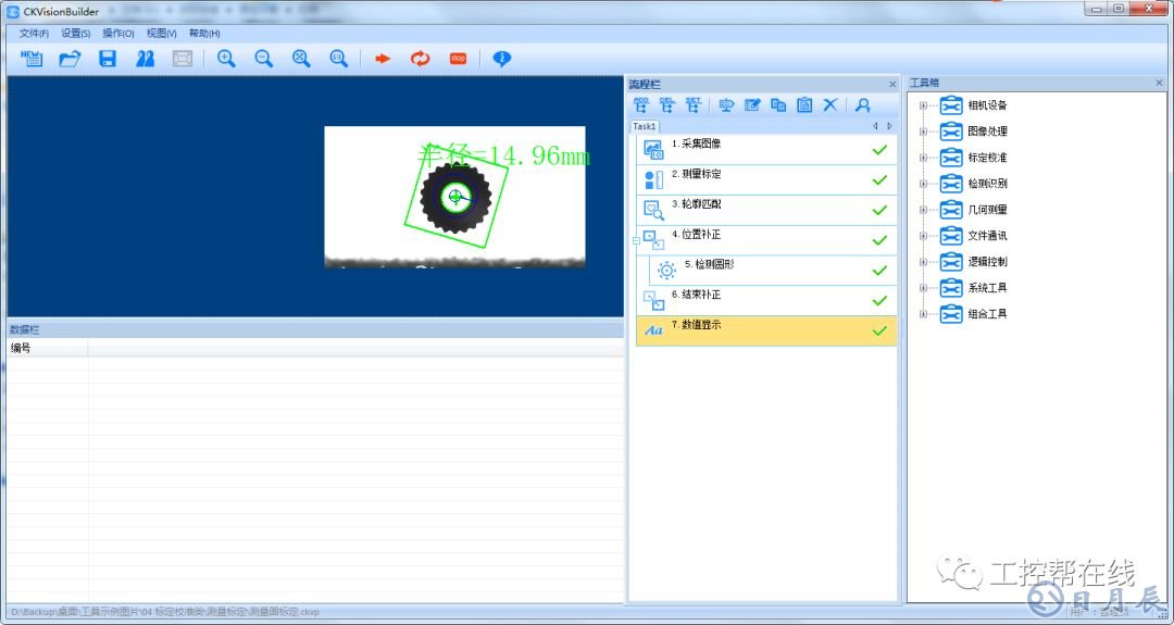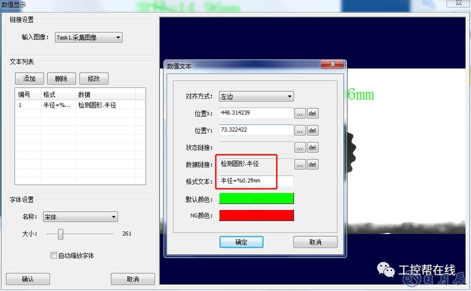 6. 數(shù)值顯示。添加“數(shù)值顯示”工具至流程欄,數(shù)據(jù)鏈接為檢測(cè)圓形的半徑,格式文本設(shè)為“半徑=%0.2f mm”如下圖6所示。