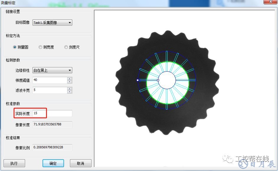 2. 測(cè)量標(biāo)定。添加“測(cè)量標(biāo)定”工具至流程欄,標(biāo)定方法設(shè)置為標(biāo)定圓,邊緣極性設(shè)置為白在黑上,梯度閾值為40,濾波半寬為5。實(shí)際長(zhǎng)度輸入圓的實(shí)際半徑長(zhǎng)度為15。如下圖2所示。