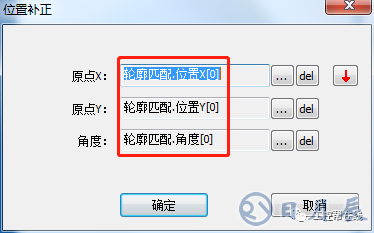 4. 位置補(bǔ)正。添加“位置補(bǔ)正”工具至流程欄,添加原點(diǎn)X、Y、角度信息,信息選擇輪廓匹配的位置,如下圖4所示。
