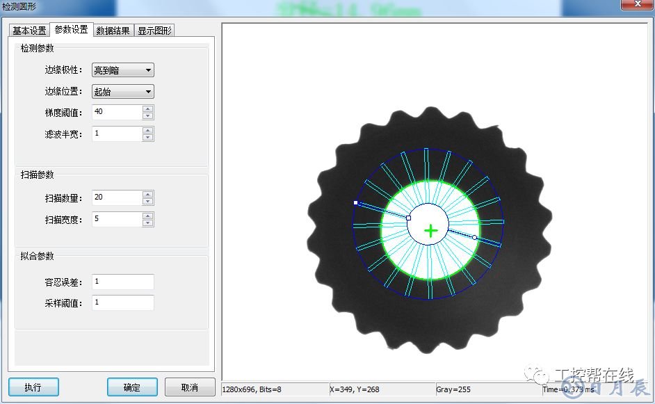 5. 檢測(cè)圓形。添加“檢測(cè)圓形”工具至位置補(bǔ)正與結(jié)束補(bǔ)正之間,邊緣極性設(shè)為“亮到暗”,邊緣位置起始,梯度閾值為40,濾波半寬1,如下圖5所示。