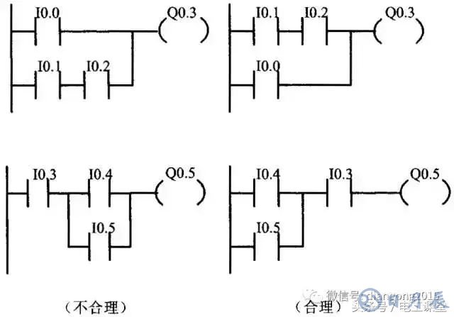 (3)幾個串聯(lián)支路相并聯(lián),應(yīng)將觸點多的支路安排在上面;幾個并聯(lián)回路的串聯(lián),應(yīng)將并聯(lián)支路數(shù)多的安排在左面。按此規(guī)則編制的梯形圖可減少用戶程序步數(shù),縮短程序掃描時間。