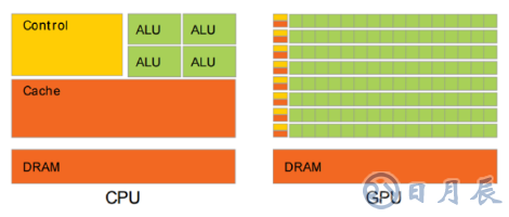 傳統(tǒng)的 CPU 之所以不適合人工智能算法的執(zhí)行,主要原因在于其計算指令遵循串行執(zhí)行的方式,沒能發(fā)揮出芯片的全部潛力。與之不同的是, GPU 具有高并行結(jié)構(gòu),在處理圖形數(shù)據(jù)和復(fù)雜算法方面擁有比 CPU 更高的效率。對比 GPU 和 CPU 在結(jié)構(gòu)上的差異, CPU大部分面積為控制器和寄存器,而 GPU 擁有更ALU(邏輯運算單元)用于數(shù)據(jù)處理,這樣的結(jié)構(gòu)適合對密集型數(shù)據(jù)進(jìn)行并行處理, CPU 與 GPU 的結(jié)構(gòu)對比如圖 所示。