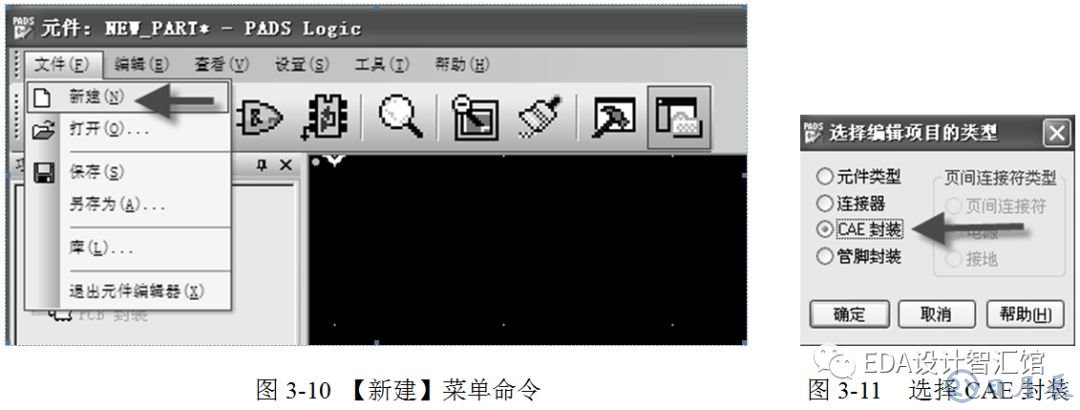 (2)執(zhí)行菜單命令【文件】→【新建】,如圖3-10所示。在彈出的“選擇編輯項目的類型”對話框中,選擇“CAE封裝”后單擊【確定】按鈕,如圖3-11所示。