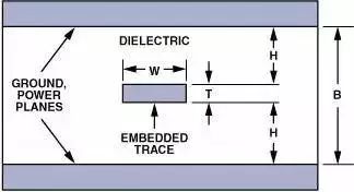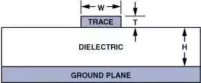 H表示從接地平面到信號印制線之間的距離,W表示印制線寬度,T表示印制線厚度;全部尺寸均以密耳(mils)(10-3英寸)為單位。εr表示PCB材料的介電常數(shù)。
