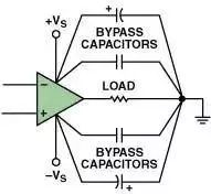 電源端到電源端:另外一種配置方法采用一個或多個旁路電容跨接在運算放大器的正電源端和負(fù)電源端之間。當(dāng)在電路中配置四個電容器很困難的情況下通常采用這種方法。