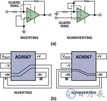 圖15(a)示出了用于運算放大器反相配置和同相配置中的保護環(huán)的原理圖。圖15(b)示出用于SOT-23-5封裝中兩種保護環(huán)的典型布線方法。