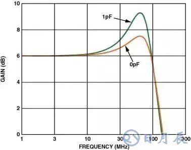 在高速電路中,很小的值就會影響電路的性能。有時候幾十個皮法(pF)的電容就足夠了。相關(guān)實例:如果在反相輸入端僅有1 pF的附加寄生電容,它在頻率域可以引起差不多2 dB的尖脈沖(見圖4)。如果寄生電容足夠大的話,它會引起電路的不穩(wěn)定和振蕩。