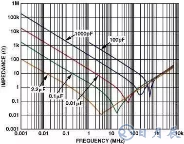 圖1示出了采用多個并聯(lián)電容器的優(yōu)點。在低頻段,大的電容器提供低阻抗的接地通路。但是一旦頻率達(dá)到了它們自身的諧振頻率,電容器的容性就會減弱,并且逐漸呈現(xiàn)出感性。這就是為什么采用多個電容器是很重要的原因:當(dāng)一個電容器的頻率響應(yīng)開始下降時,另一個電容器的頻率響應(yīng)開始其作用,所以能在許多十倍頻程范圍內(nèi)保持很低的AC阻抗。