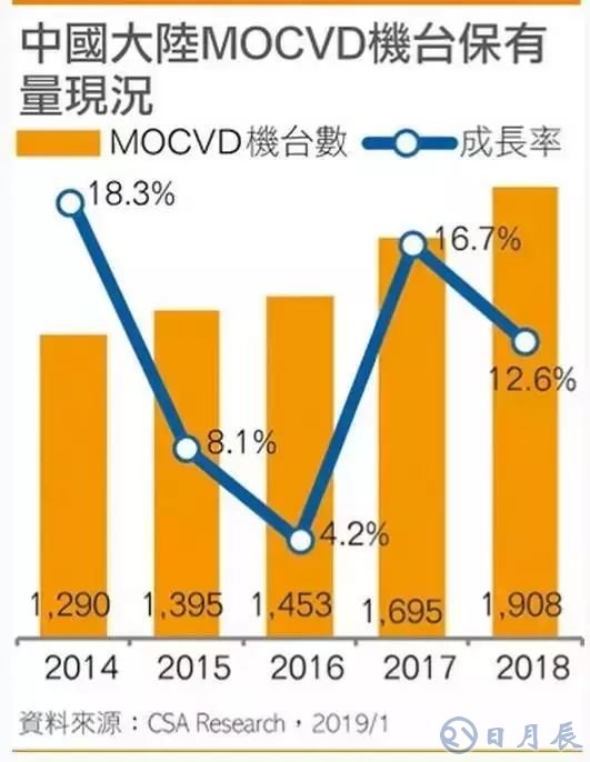 業(yè)界估計(jì),國(guó)內(nèi)LED晶粒總產(chǎn)能約達(dá)1,200萬(wàn)片/月,新增MOCVD機(jī)臺(tái)將超過(guò)210臺(tái),相較于2017年機(jī)臺(tái)規(guī)模仍有12%成長(zhǎng),但主要來(lái)自于先前擴(kuò)產(chǎn)計(jì)劃的釋放及國(guó)產(chǎn)生產(chǎn)機(jī)臺(tái)帶動(dòng)成本降價(jià)的激勵(lì),若以產(chǎn)出片數(shù)估算,新型機(jī)臺(tái)的生產(chǎn)效率提高,將帶動(dòng)2018年整體晶粒產(chǎn)出量將逾2成以上,隨著下半年景氣需求不見(jiàn)復(fù)蘇,據(jù)悉,部分業(yè)者已暫緩新增產(chǎn)能的投入進(jìn)度,初估約有200萬(wàn)片/月的新增產(chǎn)能遞延,不過(guò)預(yù)計(jì)2018年新購(gòu)置的MOCVD機(jī)臺(tái)最晚仍將在2019年釋放。