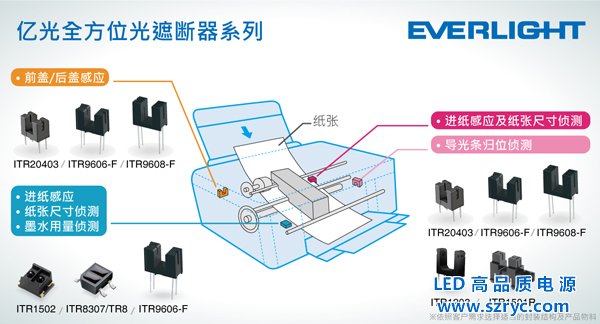 全球LED光電產(chǎn)業(yè)的龍頭制造廠,億光電子工業(yè)股份有限公司發(fā)布新款光遮斷器ITR1502系列,為反射型光遮斷器,能有效感應(yīng)物體作出即時(shí)反應(yīng),感測(cè)距離可達(dá)4mm之遠(yuǎn),反應(yīng)速度20μs,與一般市面相同特性之產(chǎn)品僅可0.5至1.0mm相比,可謂感應(yīng)能力極佳。再加上其極具成本效益的價(jià)格及已通過(guò)MSL3等品質(zhì)保證等優(yōu)勢(shì),十分適合列印機(jī)、投影機(jī)在紙張尺寸感應(yīng)、進(jìn)紙用量偵測(cè)及馬達(dá)運(yùn)轉(zhuǎn)偵測(cè)等非接觸式感應(yīng)開(kāi)關(guān)應(yīng)用。