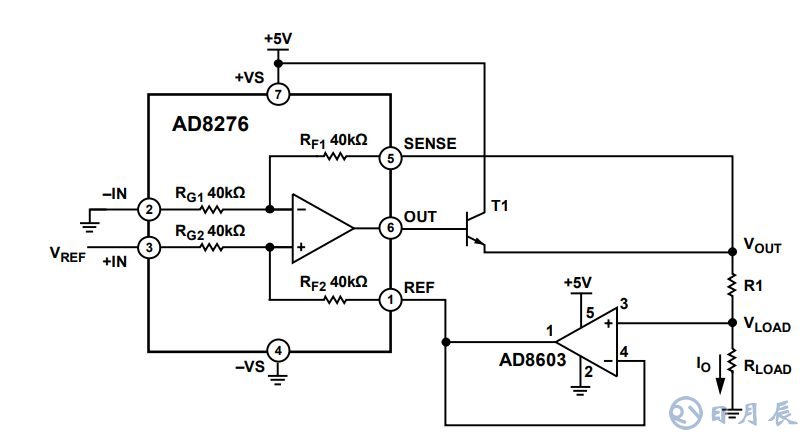 如圖是差動(dòng)放大器(AD8276)和運(yùn)算放大器(AD8603)構(gòu)成的高精度低成本的電流源電路。