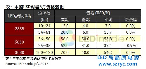 6月份市場用量最大的2835產(chǎn)品價(jià)格持穩(wěn),大功率3030產(chǎn)品價(jià)格亦止跌,小功率的5630產(chǎn)品則由于部分國際廠商調(diào)降的緣故,導(dǎo)致均價(jià)下滑。余彬指出,中國大陸LED封裝器件價(jià)格經(jīng)歷去年的快速下跌后,總算在今年第二季久逢市場回暖,價(jià)格逐漸保持穩(wěn)定。但整體而言廠商的毛利率依然較低,且由于價(jià)格難以上調(diào),短期內(nèi)產(chǎn)業(yè)盈利水平依然不容樂觀。