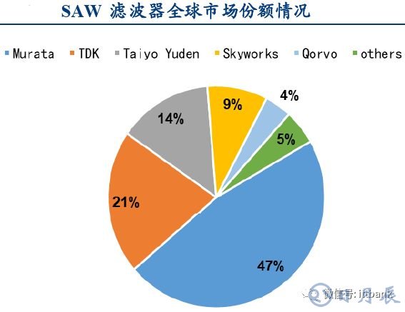 全球SAW濾波器市場份額前五位的廠商分別為村田(47%)、TDK(21%)、太陽誘電(14%)、Skyworks(9%)、Qorvo(4%),合計占比達(dá)95%。國內(nèi)SAW濾波器的廠商有麥捷科技、德清華瑩(信維通信入股)和好達(dá)電子等。