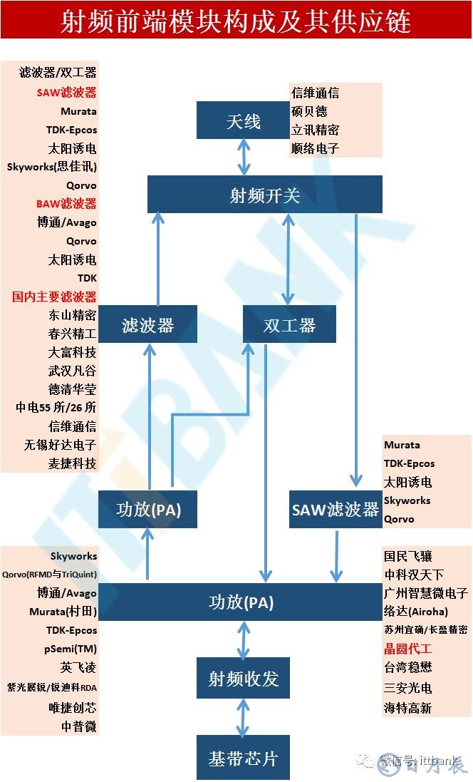 國內(nèi)設(shè)計公司有近20家,主要有漢天下、唯捷創(chuàng)芯、紫光展銳等。國內(nèi)晶圓代工廠商主要有三安光電、海特高新。