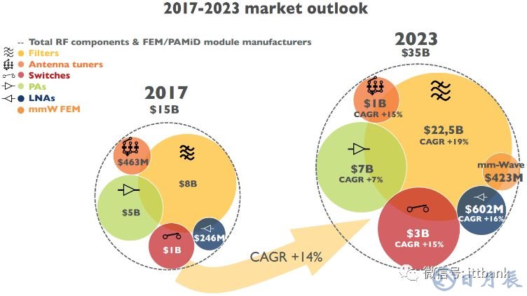 濾波器市場規(guī)模最大,2017年約80億美元,預(yù)計2023年將達(dá)到225億美元,2017~2023年CAGR=19%,主要來自于高頻通信對BAW(Bulk Acoustic Wave)濾波器的需求增長。