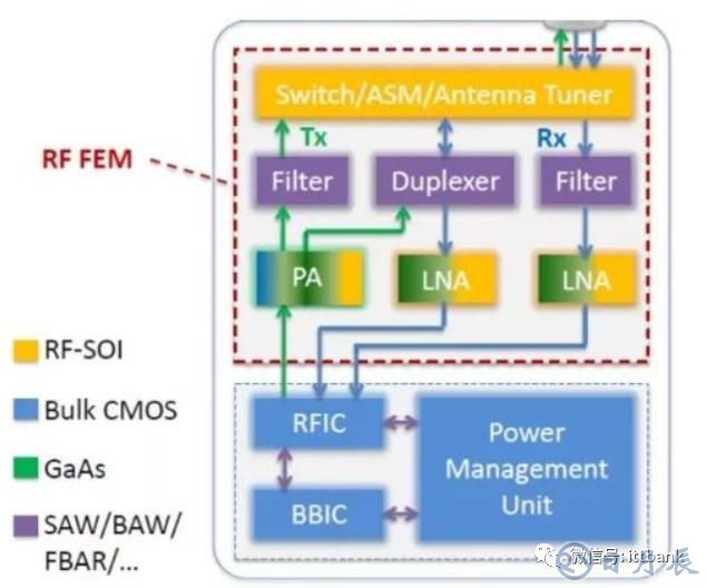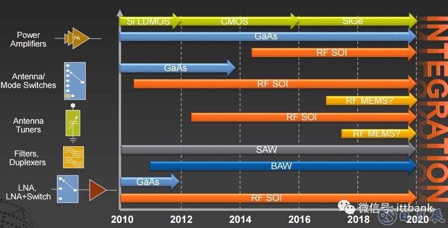 目前射頻開關(guān)、天線調(diào)諧器主要采用RF-SOI技術(shù)。濾波器、雙工主要是SAW/BAW。PA可以用CMOS、GaAs、RF-SOI技術(shù)。低噪聲放大器可以用GaAs、RF-SOI技術(shù)。