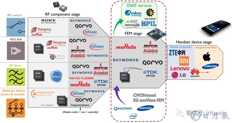 目前4G時代,智能手機(jī)射頻前端SiP封裝供應(yīng)鏈由Qorvo、博通、Skyworks、Murata、TDK-Epcos5家IDM廠商領(lǐng)導(dǎo)。他們部分生產(chǎn)外包至領(lǐng)先的OSAT廠商,如:日月光、安靠、長電科技等。目前這幾家IDM廠商主要集中于Sub6GHz解決方案。高通則想直接開發(fā)毫米波產(chǎn)品并建立供應(yīng)鏈以確保未來處于領(lǐng)先位置。